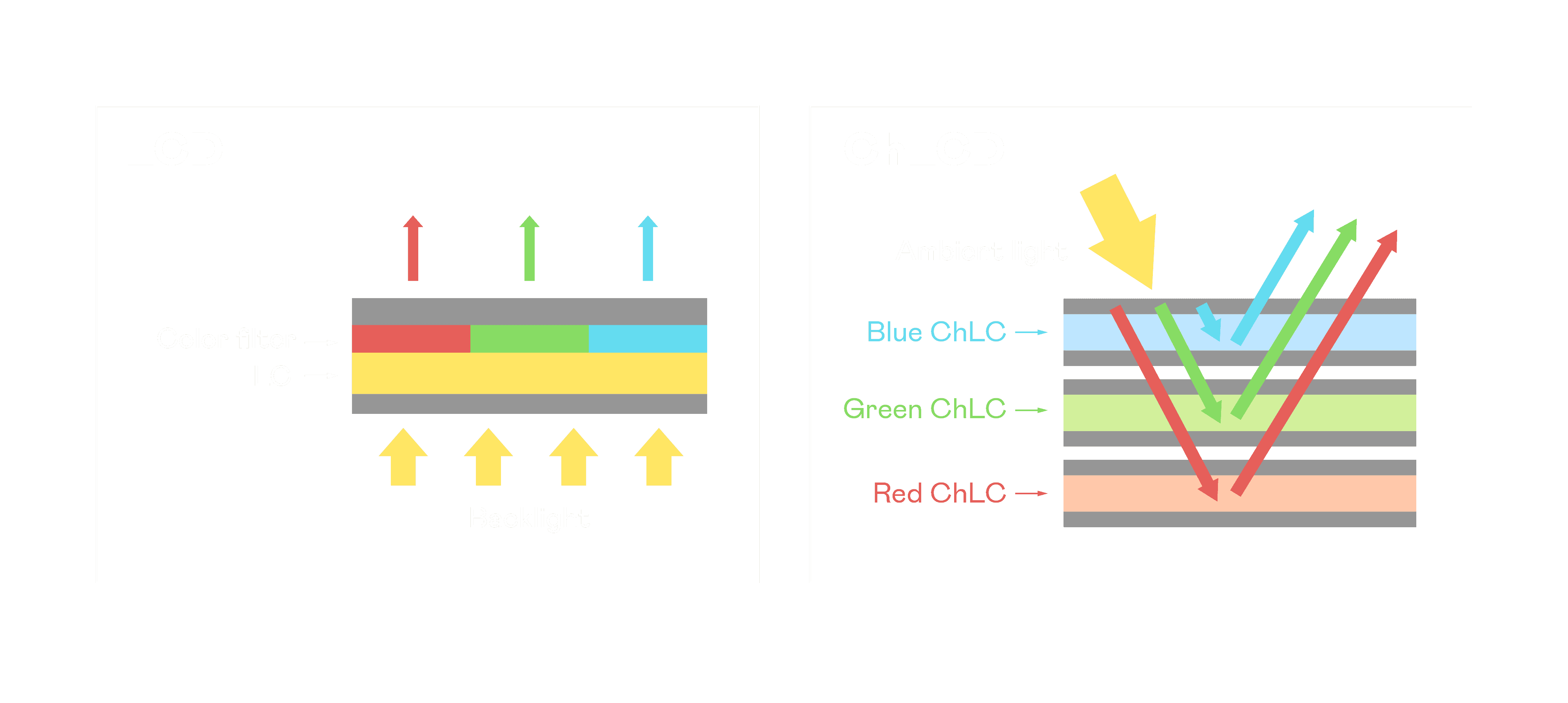 ChLCD 胆固醇液晶就如同纸张一样,,,,透过反射环境光来显示影像,,因此长时间观看不易造成人眼视觉疲劳,,,可达到护眼效果。。当处于户外阳光下使用,,,,LCD 影像容易失真而不易观看,,但胆固醇液晶仍可维持较佳的影像品质。。。。