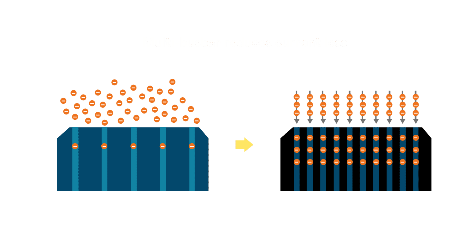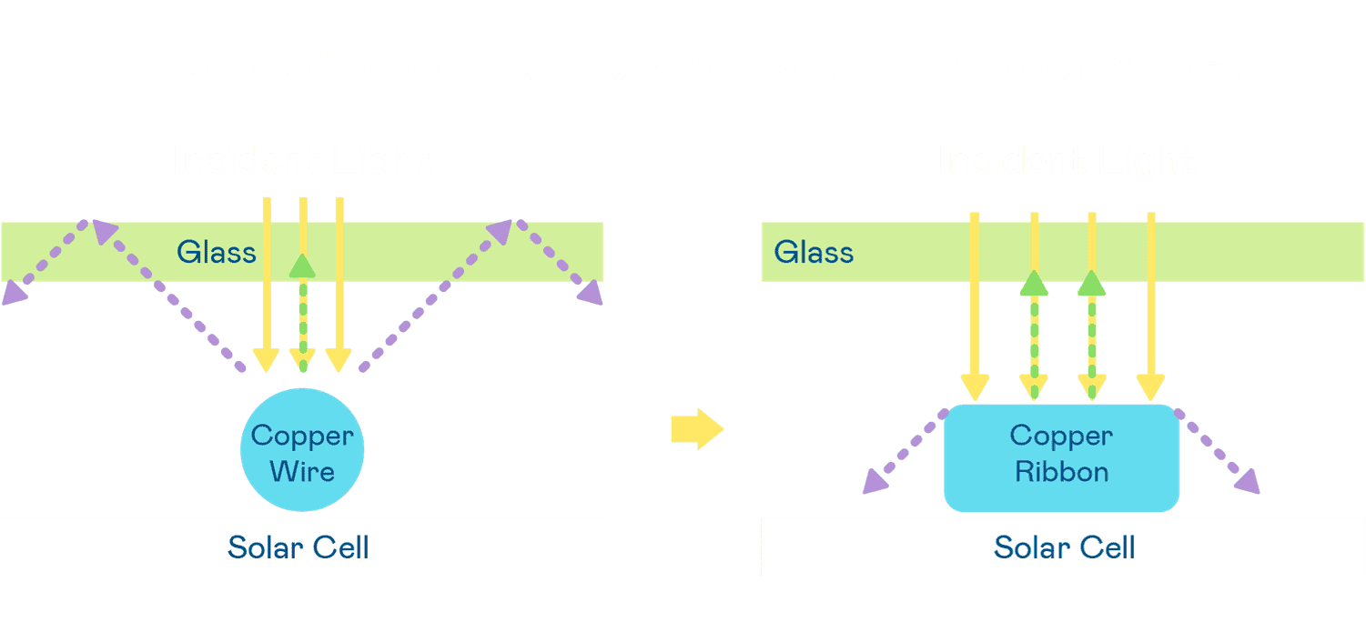 - 电池使用多条铜导线 (Copper wire) 于电池片上形成较短的电流路径,,,,提高电流收集效率,,采用圆形设计的铜导线较传统扁平式的铜焊带 (Ribbon),,,,可增加入射至电池的光线量。。