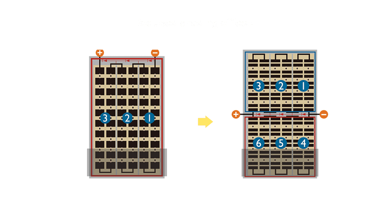 - 结合半切电池,,,,降低遮阴影响、、、、提升模组抗隐裂能力、、并减少电阻损耗,,,,进一步提升模组发电效能。。。